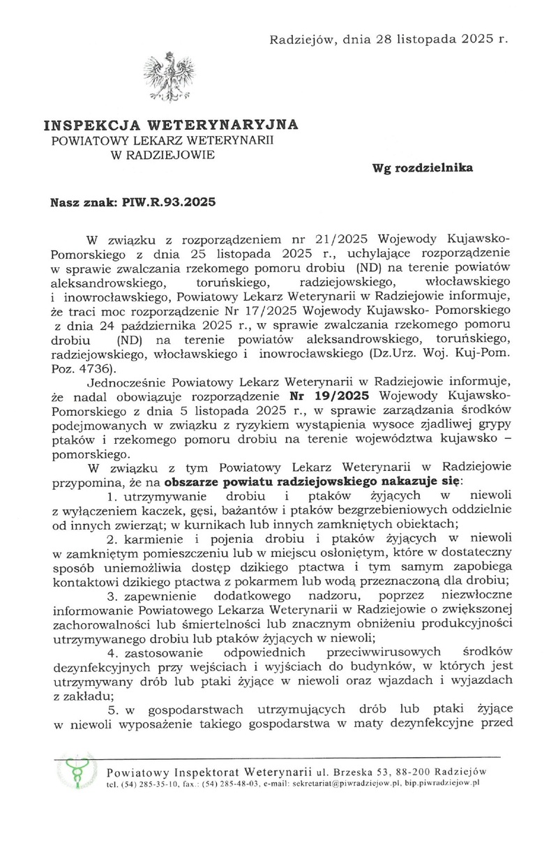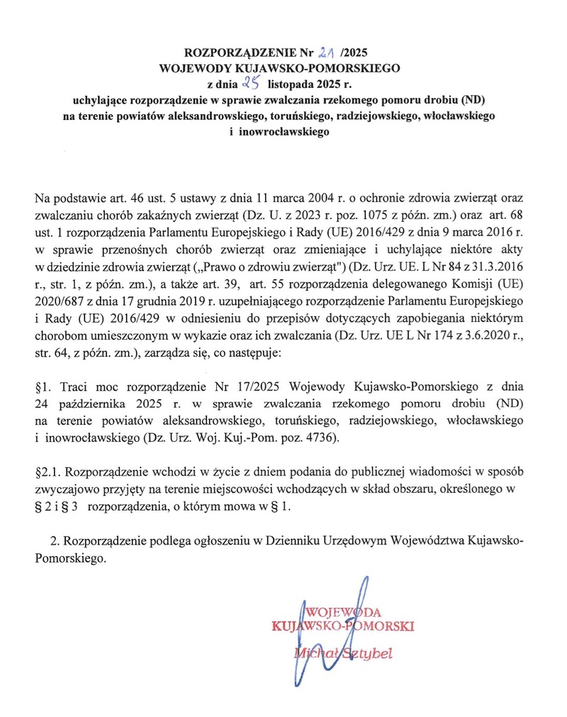 ROZPORZĄDZENIE NR 21/2025 WOJEWODY KUJAWSKO-POMORSKIEGO z dnia 25 listopada 2025 r. uchylające rozporządzenie w sprawie zwalczania rzekomego pomoru drobiu (ND) na terenie powiatów aleksandrowskiego, toruńskiego, radziejowskiego, włocławskiego i inowrocławskiego