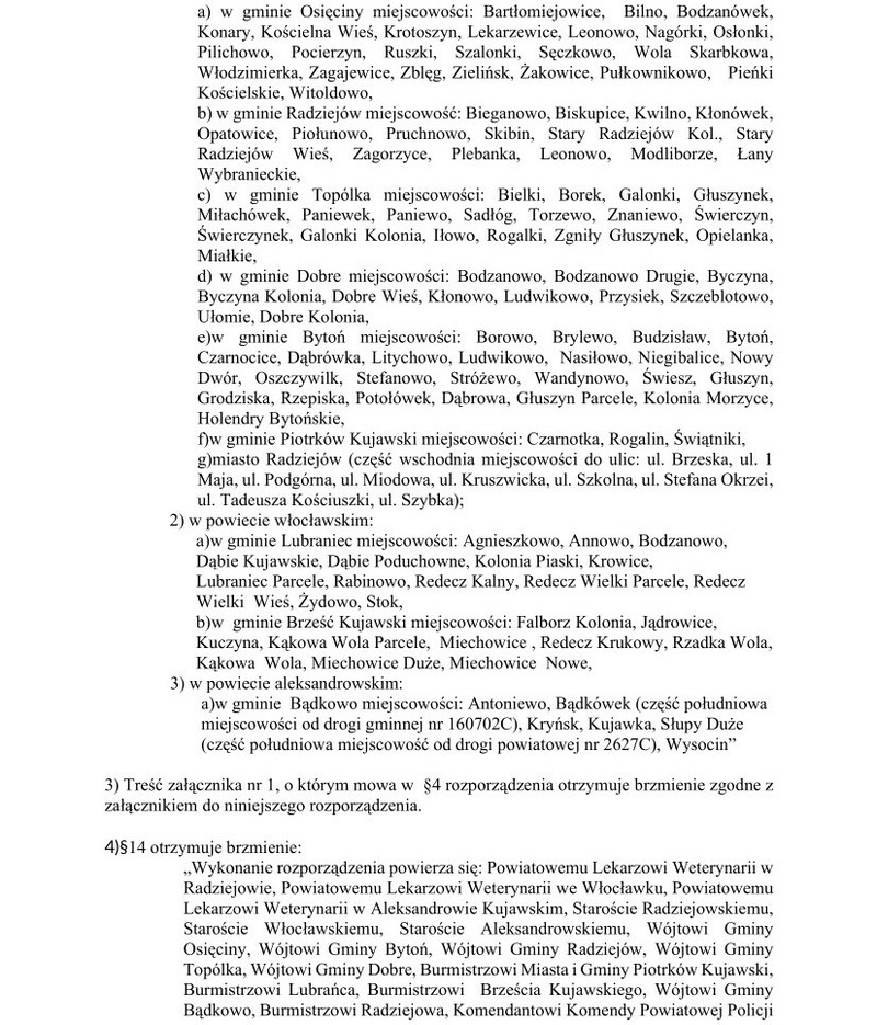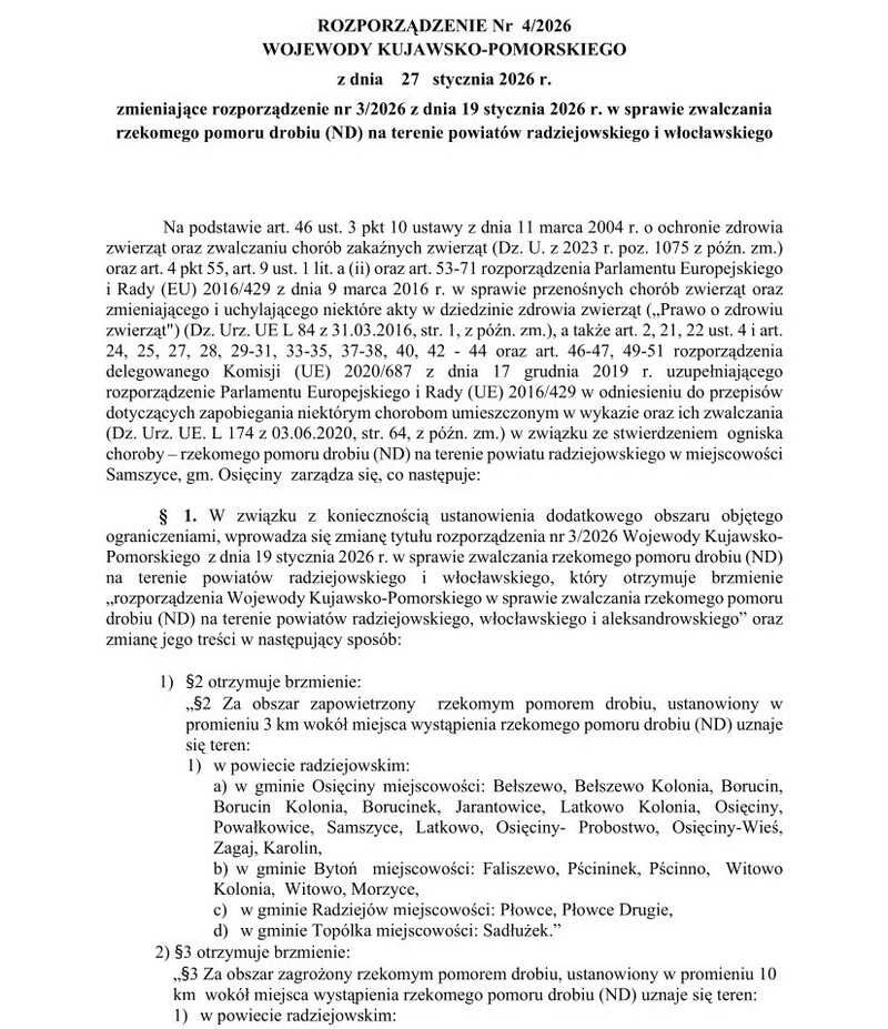 ROZPORZĄDZENIE Nr 4/2026 WOJEWODY KUJAWSKO-POMORSKIEGO z dnia 27 stycznia 2026 r. zmieniające rozporządzenie nr 3/2026 z dnia 19 stycznia 2026 r. w sprawie zwalczania rzekomego pomoru drobiu (ND) na terenie powiatów radziejowskiego i włocławskiego