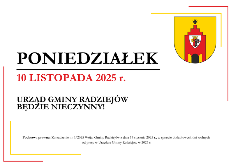 ⛔️Informujemy, że dnia 10 listopada 2025 roku (tj. poniedziałek), Urząd Gminy Radziejów będzie nieczynny.