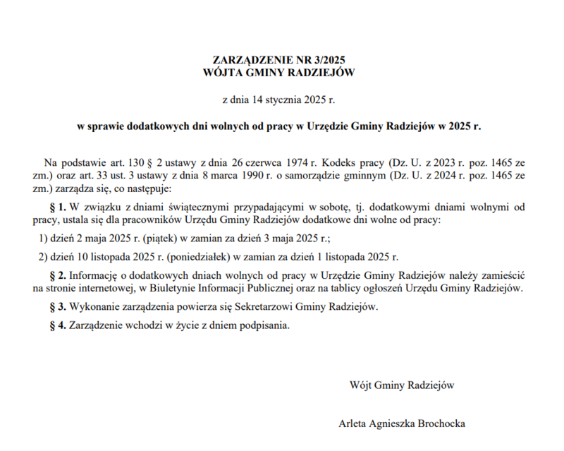 ✅Podstawa prawna: Zarządzenie nr 3/2025 Wójta Gminy Radziejów z dnia 14 stycznia 2025 r., w sprawie dodatkowych dni wolnych od pracy w Urzędzie Gminy Radziejów w 2025 r. Za utrudnienia przepraszamy💚