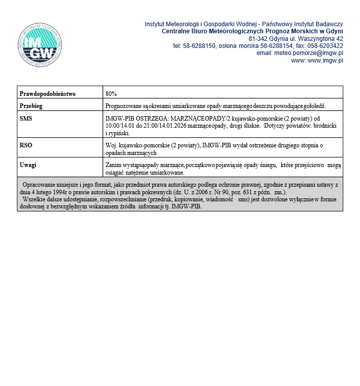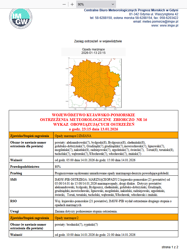 Zasięg ostrzeżeń w województwie WOJEWÓDZTWO KUJAWSKO-POMORSKIE OSTRZEŻENIA METEOROLOGICZNE ZBIORCZO NR 16 WYKAZ OBOWIĄZUJĄCYCH OSTRZEŻEŃ o godz. 23:15 dnia 13.01.2026