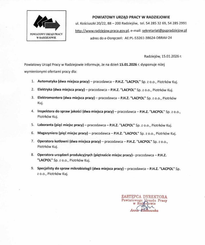 Oferty Pracy - Powiatowy Urząd Pracy w Radziejowie na dzień 15.01.2026 r.