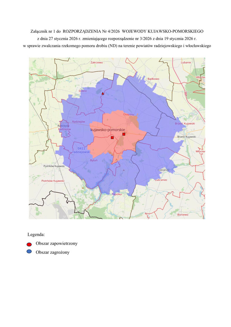 ROZPORZĄDZENIE Nr 4/2026 WOJEWODY KUJAWSKO-POMORSKIEGO z dnia 27 stycznia 2026 r. zmieniające rozporządzenie nr 3/2026 z dnia 19 stycznia 2026 r. w sprawie zwalczania rzekomego pomoru drobiu (ND) na terenie powiatów radziejowskiego i włocławskiego